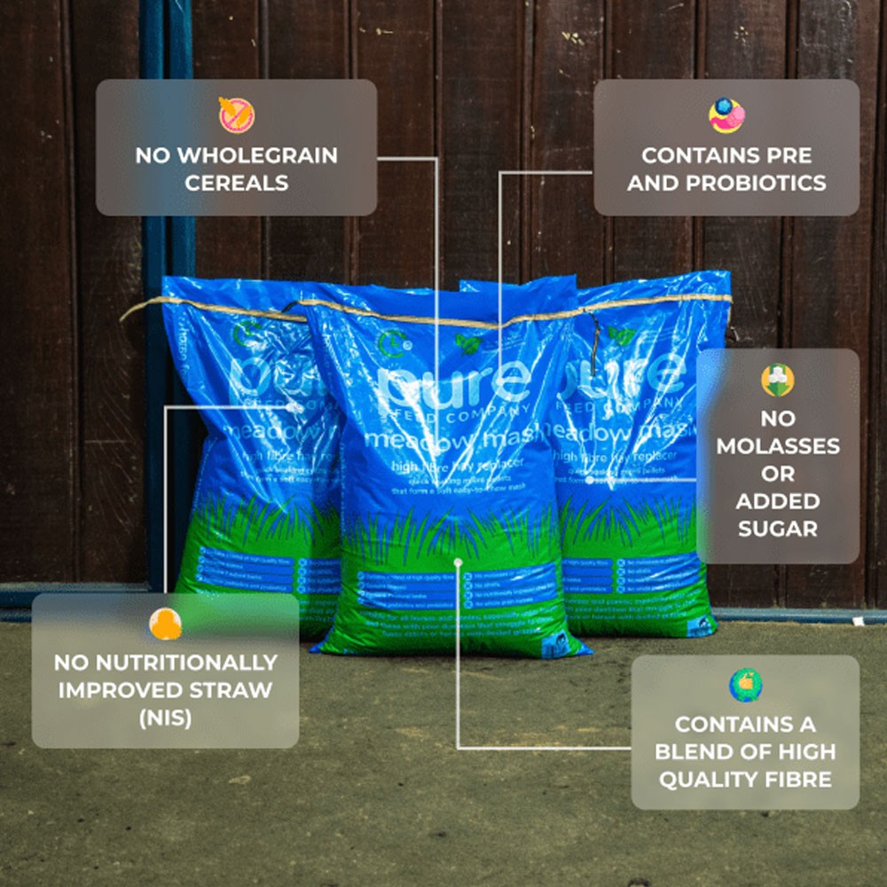 Pure Meadow Mash packs all the goodness of hay into a high-fibre micro-pellet that soaks quickly into a soft, easy-to-chew mash. It provides the essential nutrients of hay but in a more convenient, palatable form, making it ideal for horses with dental issues or those struggling with hay. Free from molasses and wholegrain cereals, it’s low in sugar and starch, perfect for excitable horses or those needing a low-starch diet. The blend of high-quality fibre, prebiotics, and probiotics helps support digestive health, while the super fibres retain water, aiding hydration and fluid intake.